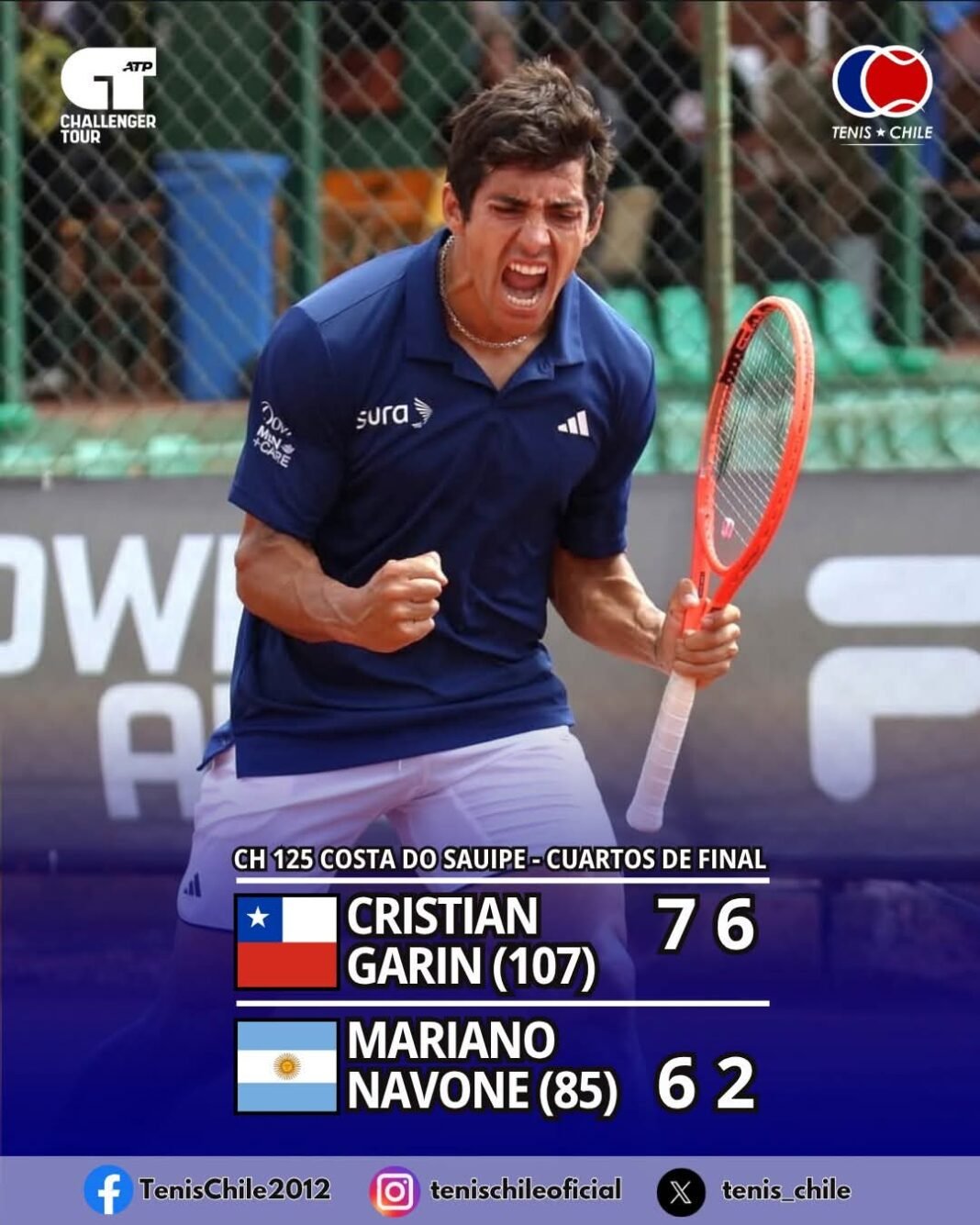 ➡️  Cristian Garin (107° ATP) avanzó a las semifinales del Challenger 125 de Costa Do Sauipe tras vencer al argentino  Mariano Navone (85° ATP), primer sembrado del torneo, por dos sets a cero en un duro partido de dos horas. El chileno fue más preciso en el tie-break del primer set y dominó el segundo con un rápido quiebre para cerrar 2-0. Con este triunfo, Garin suma 35 puntos ATP y sube al puesto #105 del live ranking. En semifinales enfrentará al paraguayo  Daniel Vallejo (190° ATP