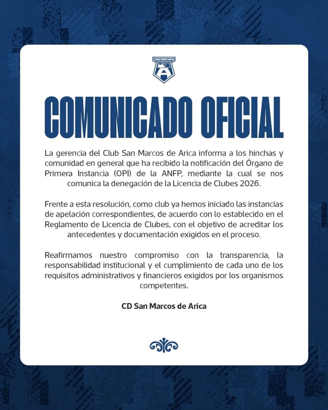 ➡️ San Marcos de Arica enfrenta un posible descenso por secretaría tras perder su licencia de clubes para 2026.