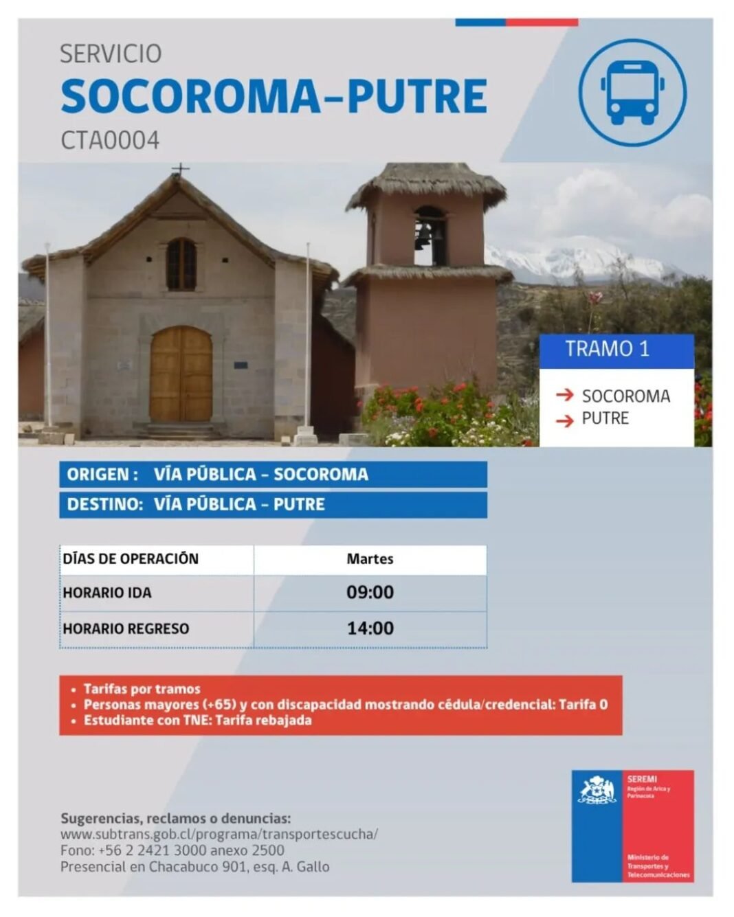 El servicio subsidiado CTA0004 une #Socoroma y #Putre, facilitando el traslado de vecinas y vecinos hacia la capital provincial de #Parinacota.